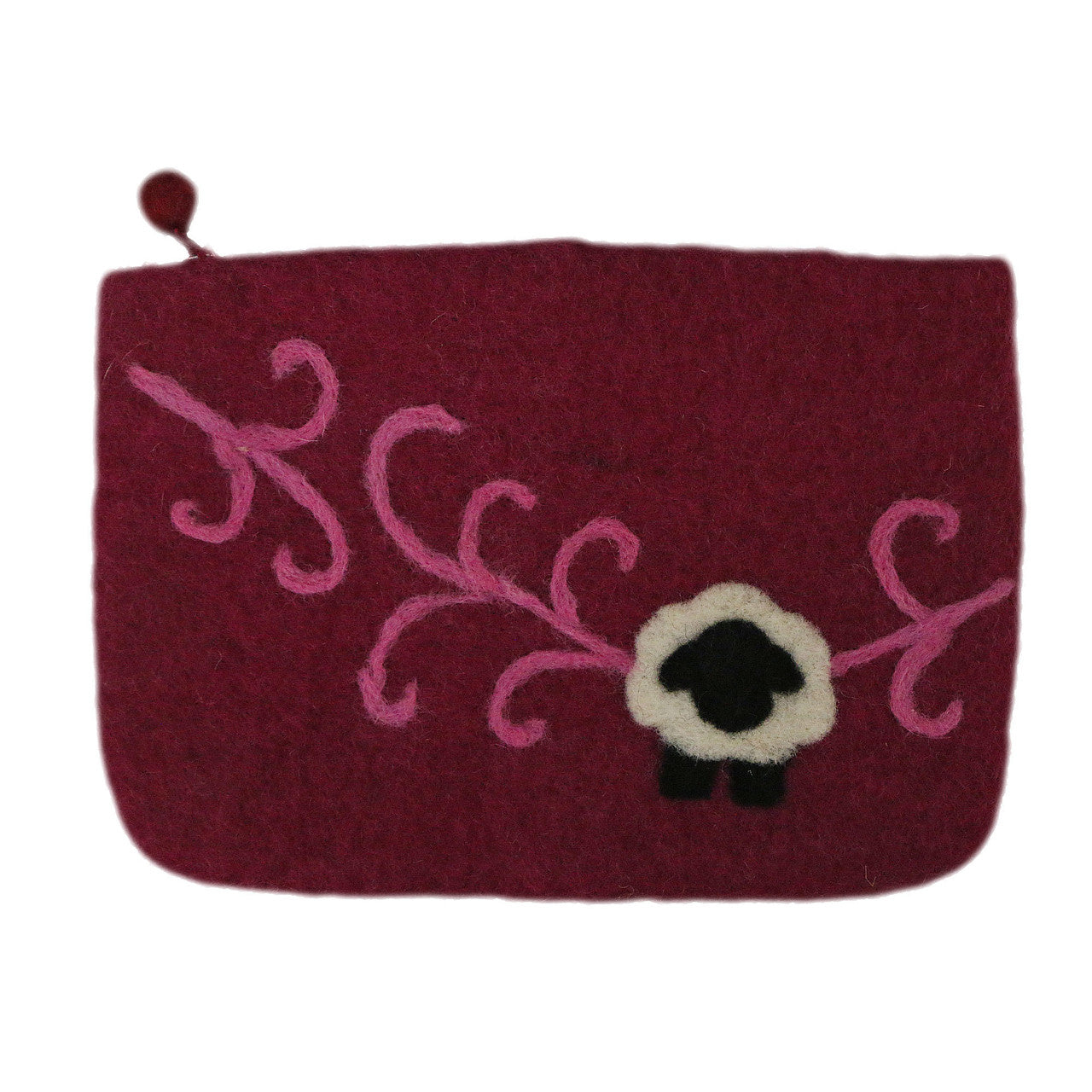 This large sized notions bag, suited for double pointed needles or circulars, features a sheep accented with needle felted swirl detailing.