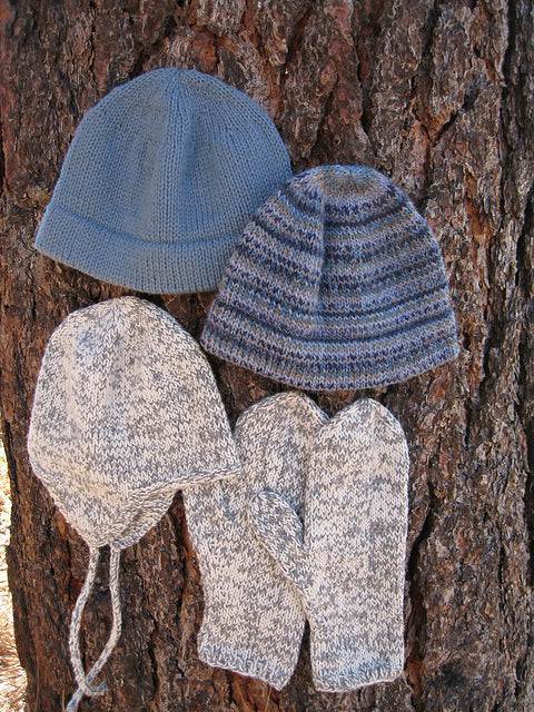 A set every guy can appreciate. Simple hemmed hat or earflap hat for men, with sturdy mittens. Uses heavy worsted weight yarn knitted tightly for wear at a gauge of 18 sts to 4 inches.