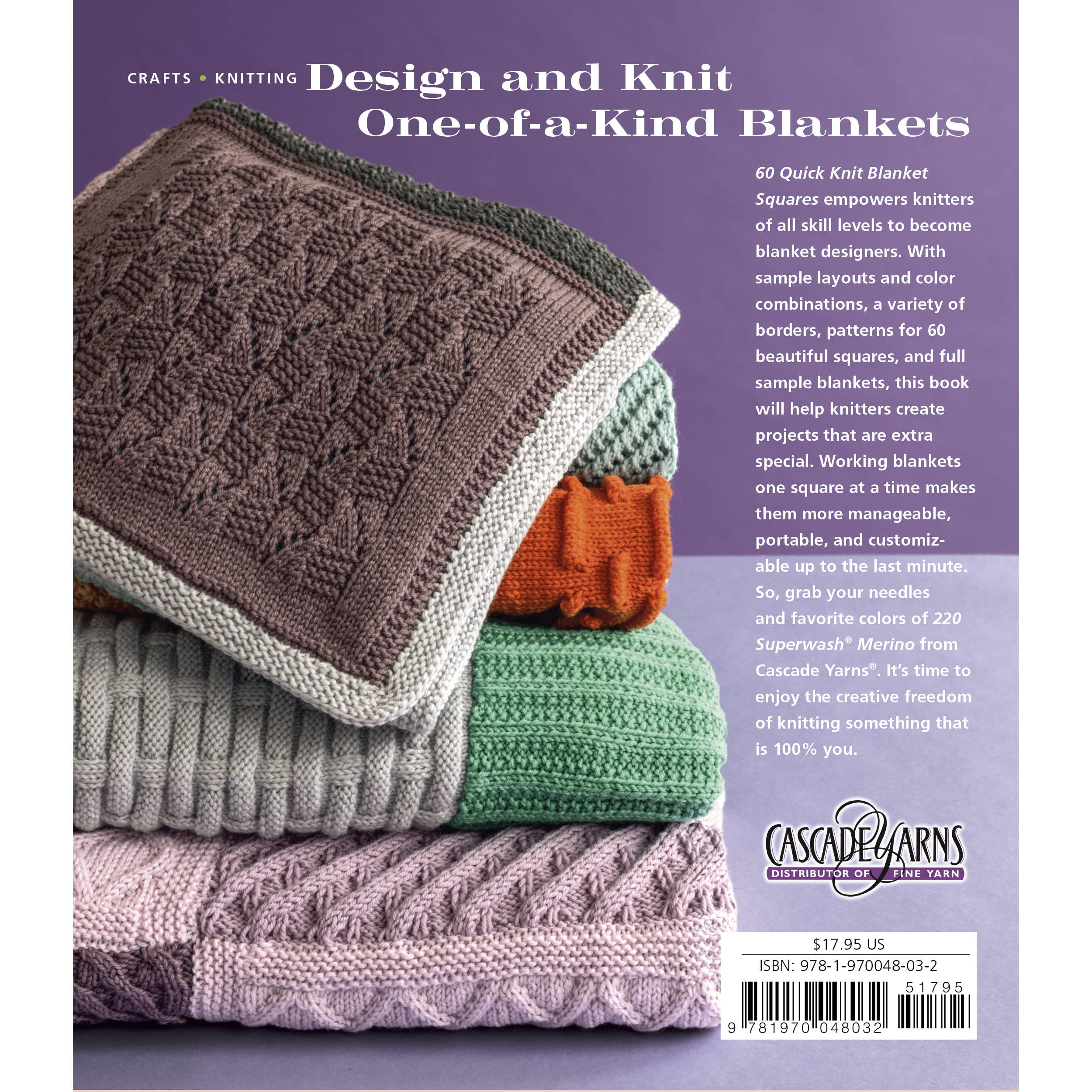 Create your own one-of a-kind designs with 60 Quick Knit Blanket Squares! With 60 beautiful patterns that span all skill levels and include knit and purl textures, cables, lace, and unique stitches, sample color combinations, a range of blanket sizes, a variety of edgings, and several inspirational blanket patterns, even the most hesitant knitter will find plenty to kick-start their creativity. Knitting a blanket by making individual 12 x 12" squares means knitters can work on the go year-round without overheating as they wrestle ever-growing blankets. This approach to knitting blankets is simple, easy, and adaptable up to the very last minute. These patterns are written for worsted-weight yarn, making it easy to find yarn from your stash or to choose from a wide range of new yarns!