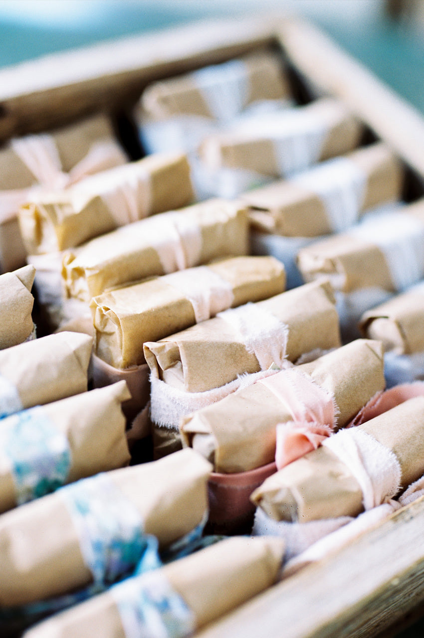 After you have used the lotion bar all up, there will not be a bottle remaining that would get thrown in the landfill or need to be recycled. We wrap the lotion bars in 100% recycled Kraft paper and reuse fabric as ribbons.