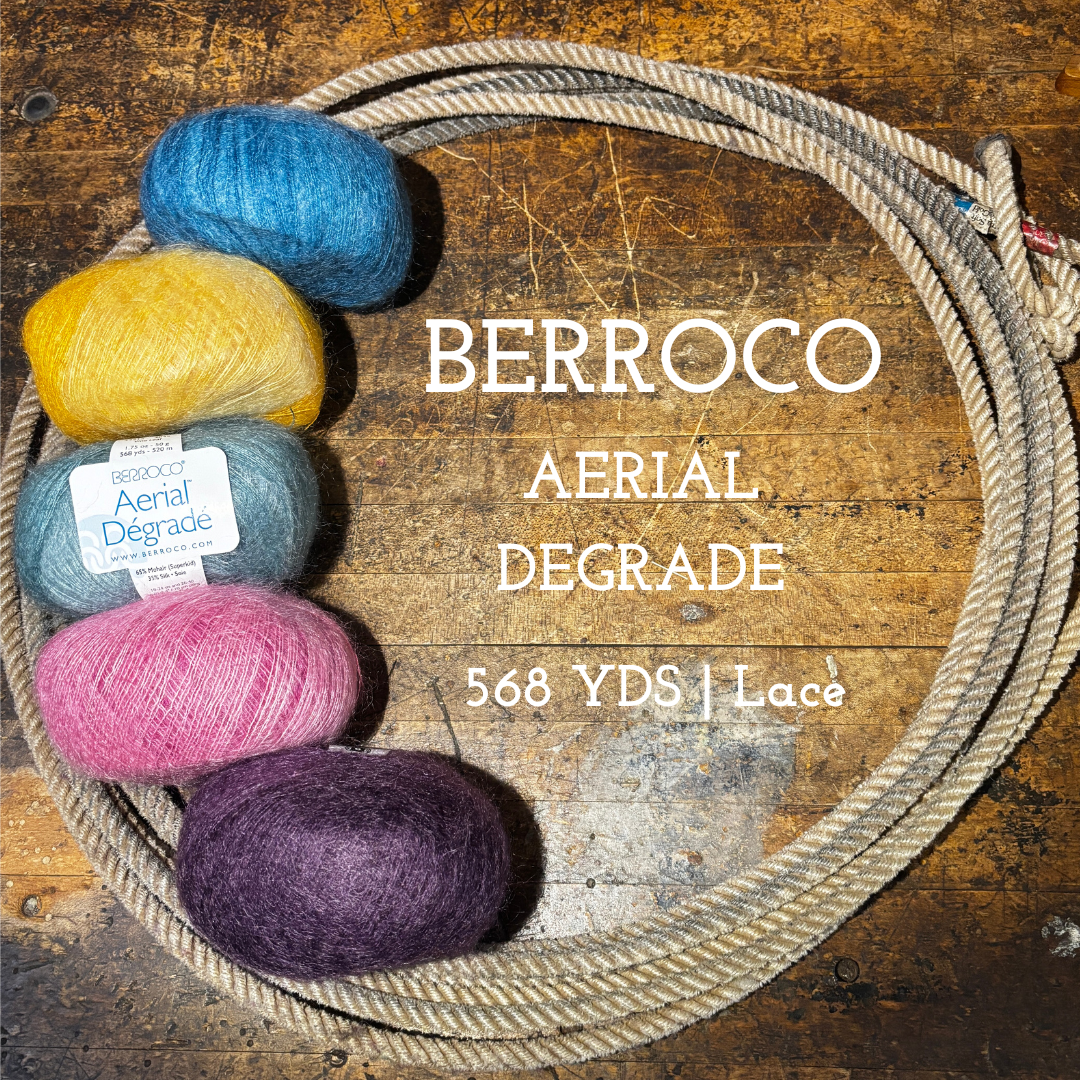 Berroco Aerial Dégradé takes the luxurious silk and mohair base you love and adds gorgeous ombré color fades. Perfect for carrying along with workhorse yarns to add a soft halo and beautiful color shift!