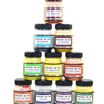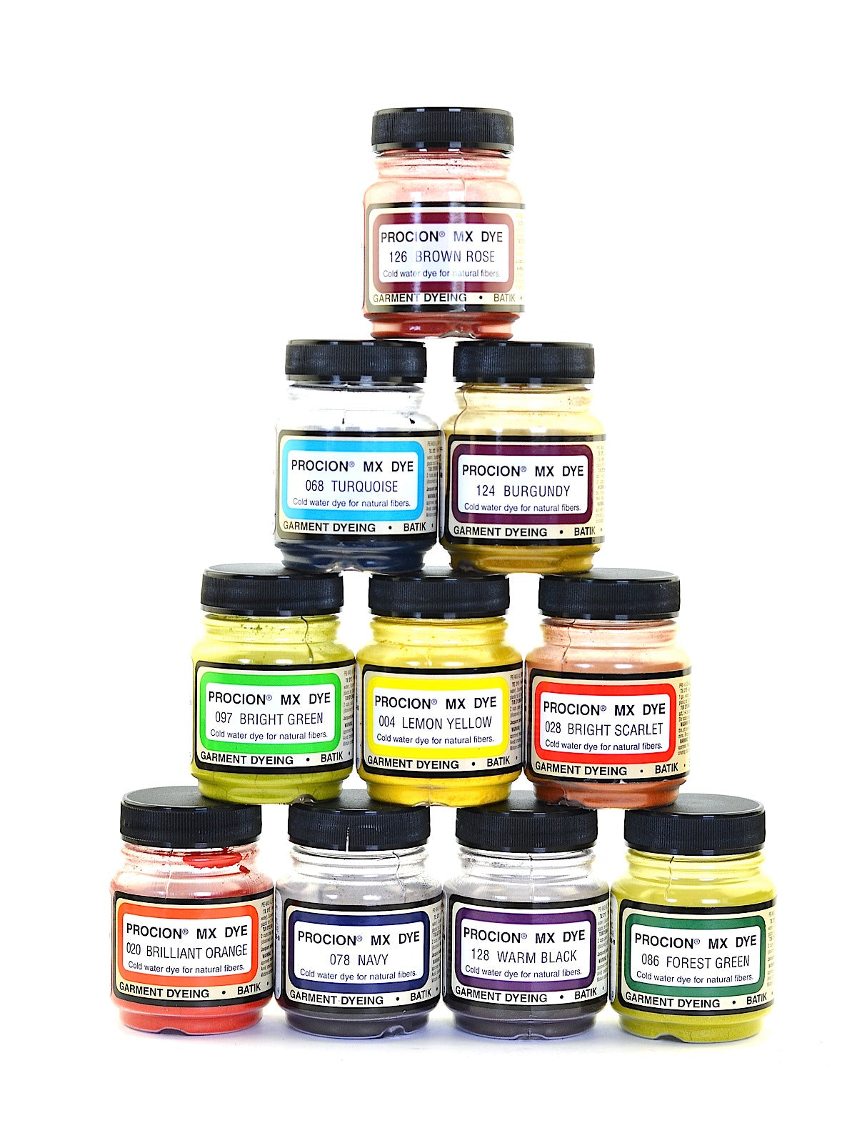 Procion MX dyes are “cold water dyes” that are fixed chemically instead of with heat. This unique property sets Procion MX apart from all other dyes and establishes them as the undisputed king of backyard dyeing, batik and tie dye. Because Procion MX dyes can be used away from the stovetop, they are also the ideal colors for shibori, ice dyeing, tub and low water immersion dyeing, printing, direct painting and other “alternative” dye applications. As a fiber-reactive dye, Procion MX forms a strong covalent bond with cellulosic fibers, making it the most permanent and washfast of all dyestuffs. Mix the concentrated dye powder with tap water to create the most vibrant colors possible for cotton, linen and other plant-based fabrics (may also be used with protein fibers if acidified). Procion MX dyes are typically used with a soda ash fixative, which can be added directly to the dye bath or used to pretreat the fabric as in tie dyeing and other “batch setting” techniques. Typically, one 2/3 oz/18.71 g bottle will dye more than 1 lb/0.45 kg of dry fabric (very bright colors will require more dye and pastel colors will require less).