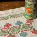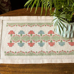 The Calliope's Meadow folk embroidery kit—inspired by a tiny border on a traditional bed curtain from the Greek islands—is made up of carnations alternating with flower bud sprays which create a beautiful chevron border effect. The fresh and delicate colors evoke a meadow presided over by Calliope, muse of poetry and eloquence. Shown worked as a table runner, it would be beautiful as a cushion cover or wall hanging.